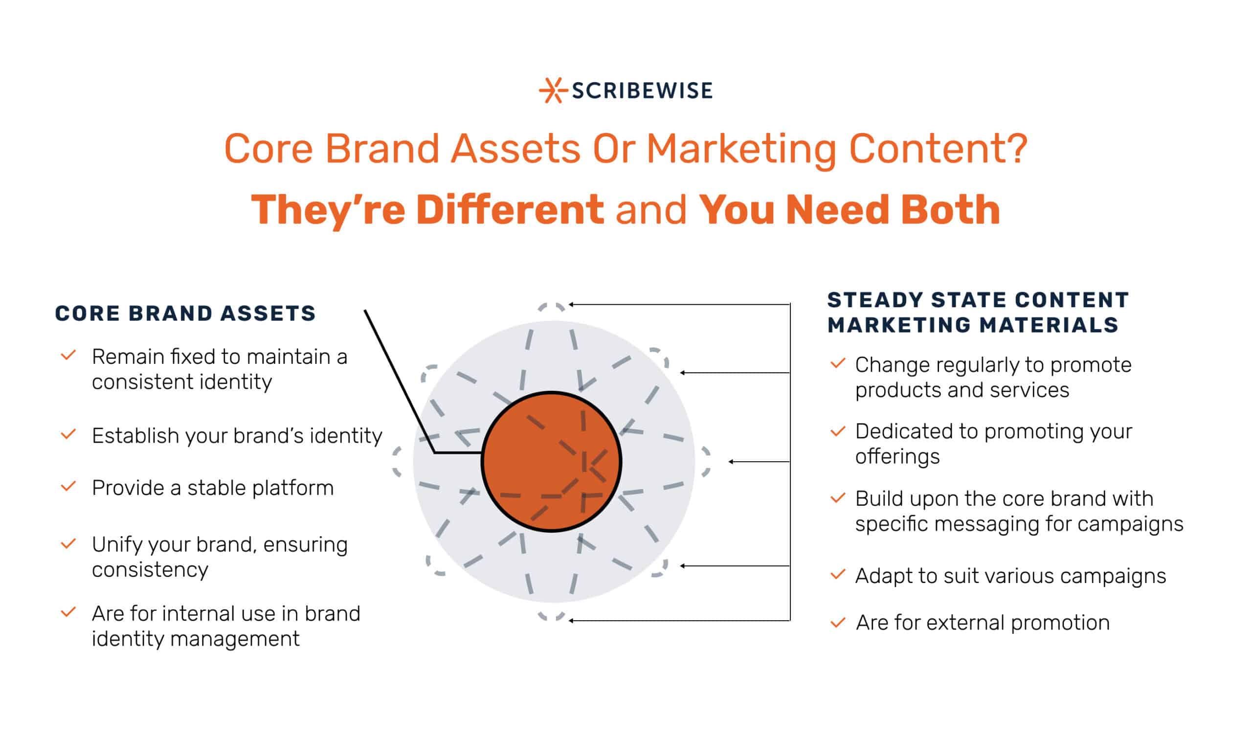 Core brand assets (CBAs) are essential to your brand identity. There’s a difference between CBAs and what we’ll call “steady state marketing content.” Steady state marketing content is always flowing, and changes based on campaigns and initiatives. CBAs, on the other hand, are your brand’s fundamental visual and messaging elements that remain consistent over time. These assets include: