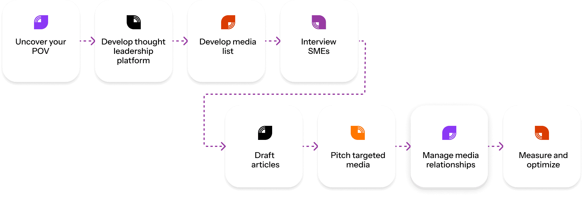 We start at the firm-wide level, working with you to uncover your organization’s industry point of view and establish your thought leadership platform. Our goal is for all of our efforts to ladder up to this organizational POV, which creates consistency and resonates with the media.
